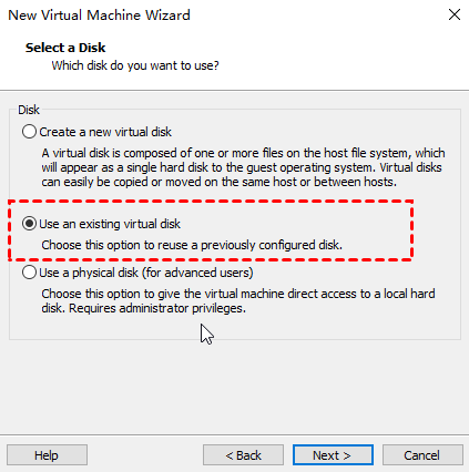 Nun schließen Sie den Prozess zum Zusammenführen mehrerer VMDKs in eine einzige Datei in Workstation ab. Bitte wählen Sie „Vorhandene virtuelle Festplatte verwenden“ (mit der neuen einzelnen VMDK-Datei), um eine virtuelle Maschine zu erstellen.