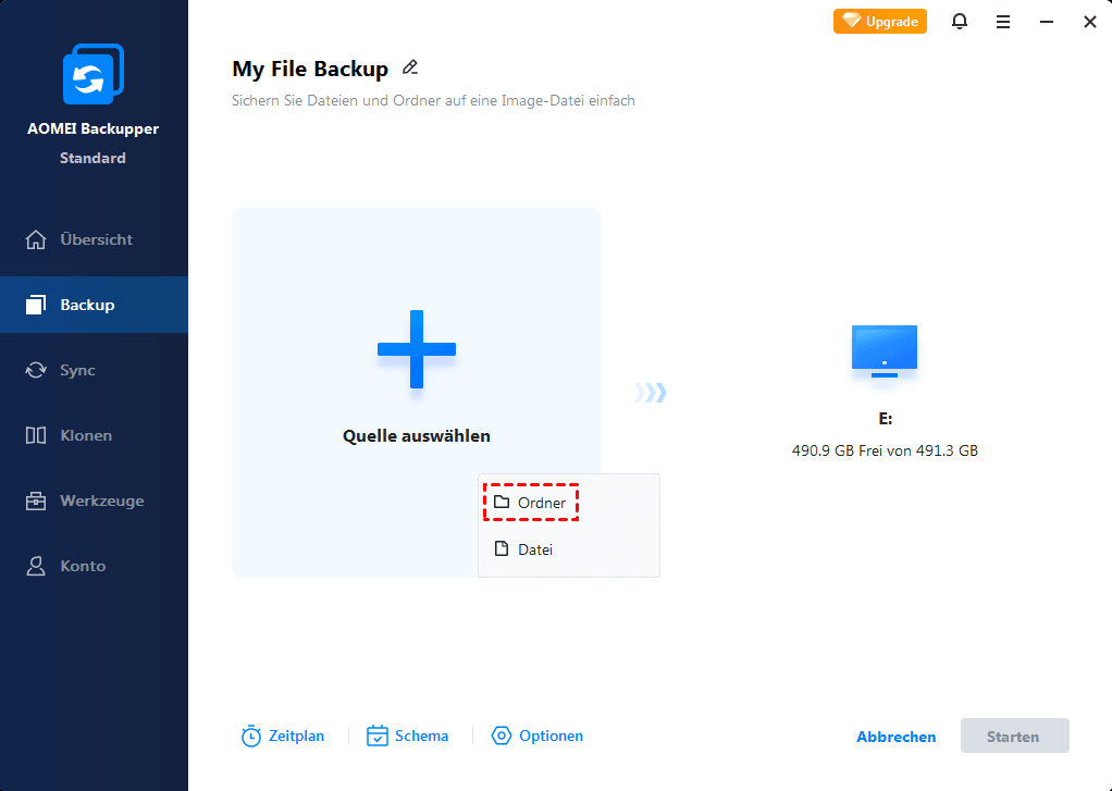 AOMEI Backupper bietet eine Funktion der Dateisicherung, um durch Kopieren dieser Dateien von einem Quellordner auf einen Zielordner Dateien und Ordner zu sichern. Diese Funktion ist sehr nützlich, wenn Sie nur eine individuelle Datei statt einer Vollsicherung sichern möchten.