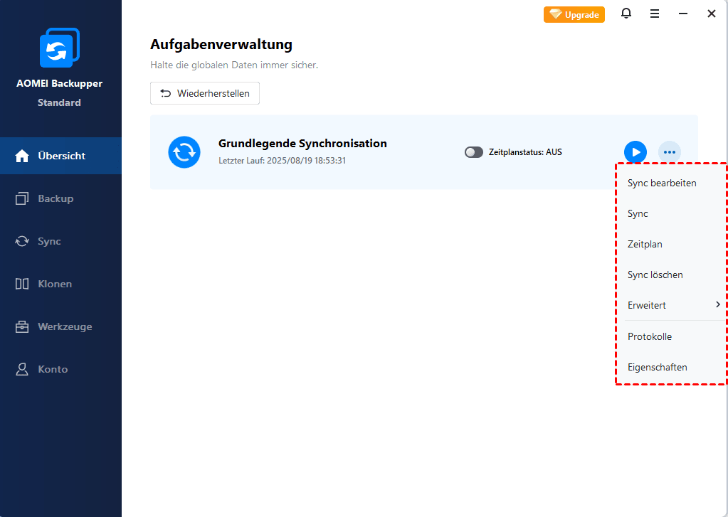 Schritt 1. Bitte downloaden und installieren Sie AOMEI Backupper, und wählen Sie Sync. Und dann wählen Sie Grundlegende Synchronisation, und Sie werden die Schnittstelle genau wie das Bild unten ansehen.