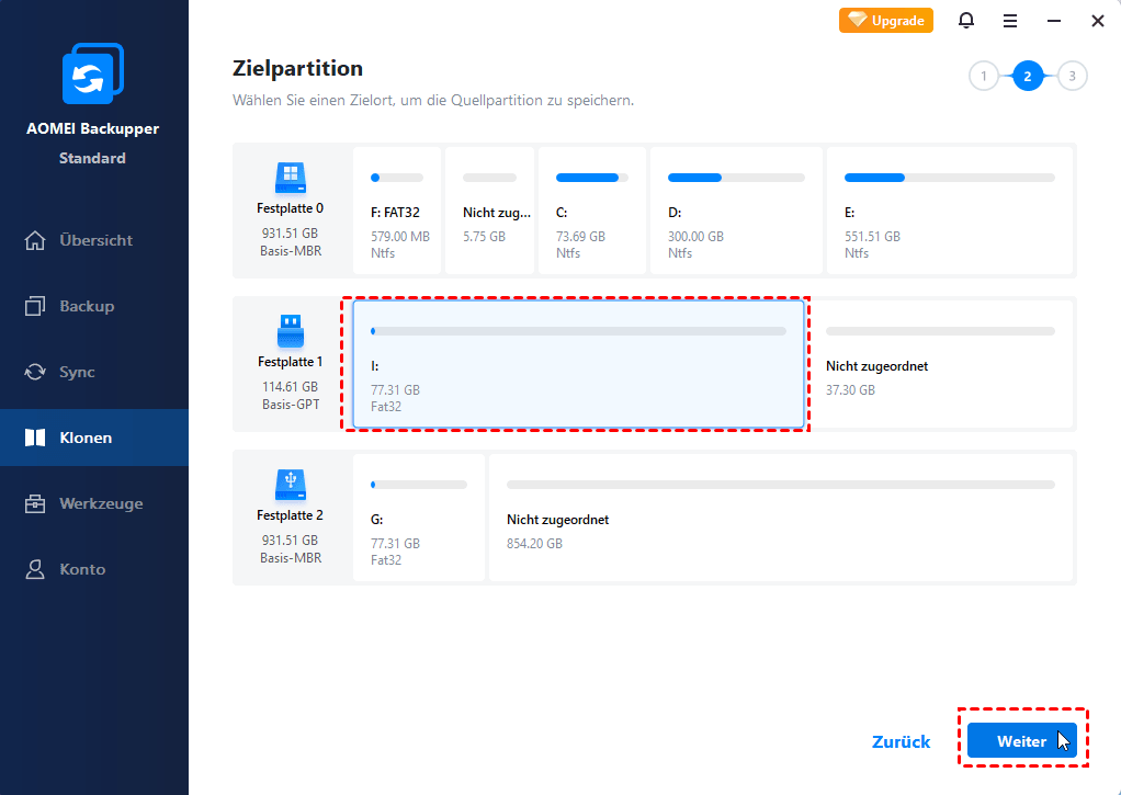 Schritt 3. Wählen Sie eine Zielpartition (Ich wähle Disk 1 als Zielpartition), klicken Sie auf Weiter, um fortzufahren.