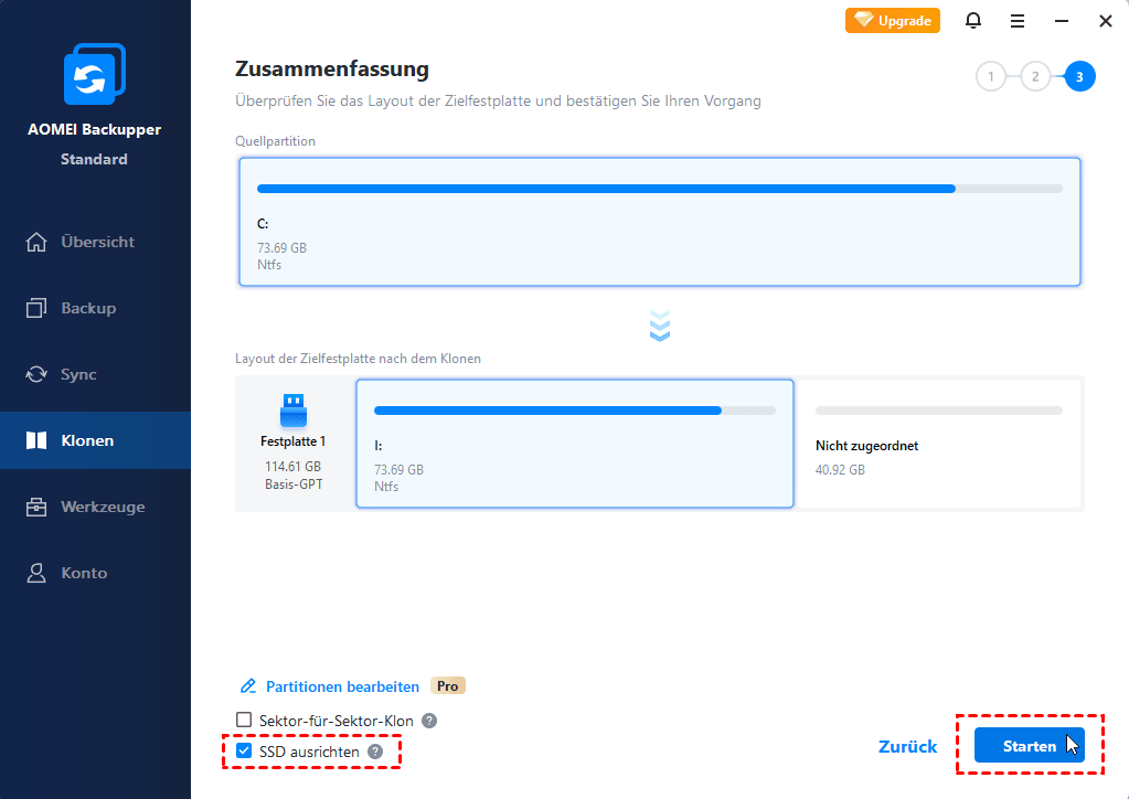 Schritt 2. Während des Wiederherstellungsprozesses befolgen Sie die Aufforderungen, um immer auf "Weiter" zu klicken. Sehen Sie direkt das folgende Screenshot, kreuzen Sie die Option "SSD ausrichten" im Fenster von Zusammenfassung an. Danach klicken Sie auf Starten, um diese Operation auszuführen.