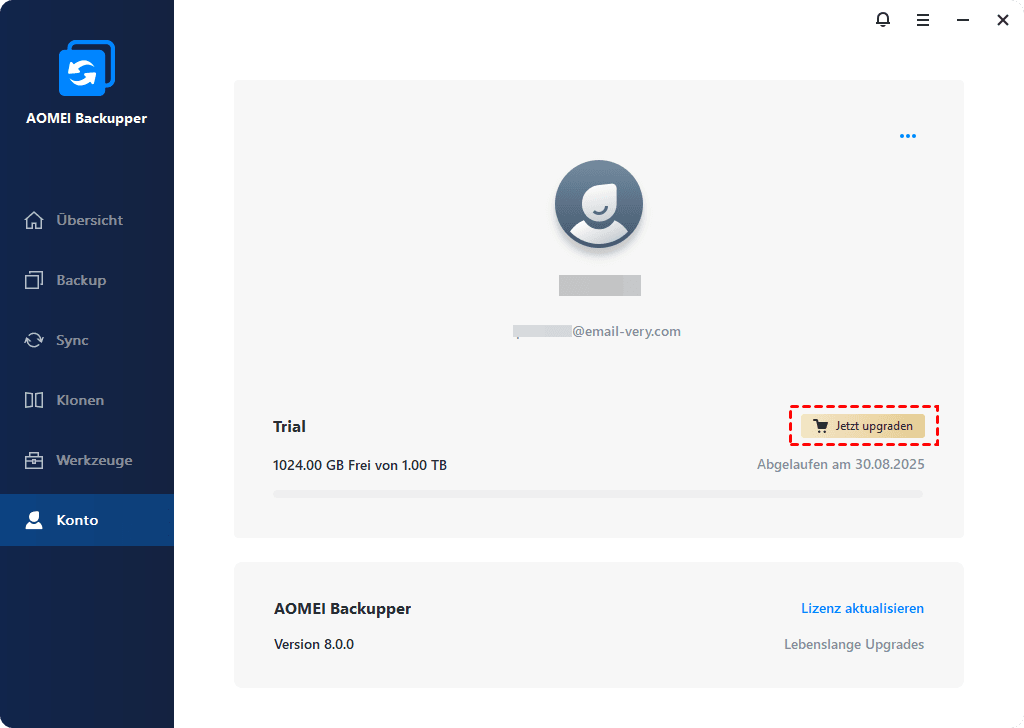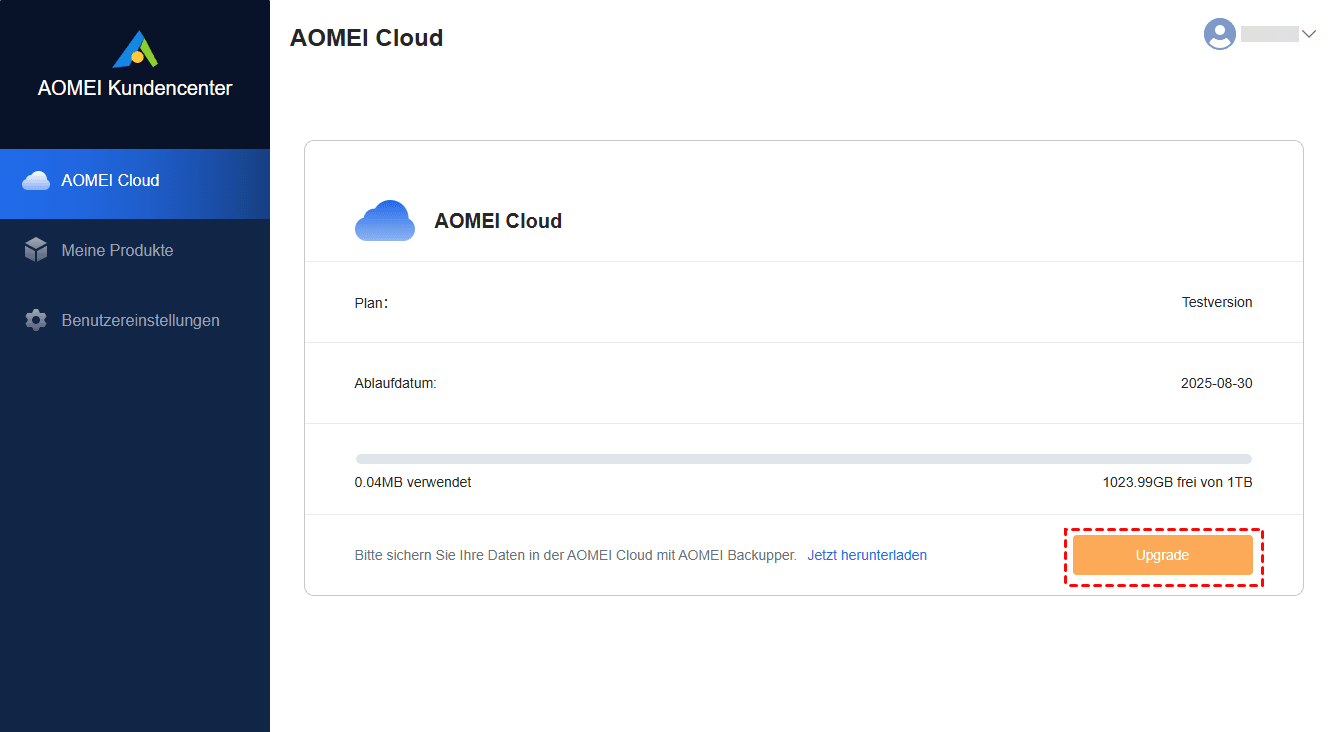 In der AOMEI Cloud-Oberfläche werden der Plan Ihrer AOMEI Cloud, das Ablaufdatum und die Cloud-Speicherdetails angezeigt. Wenn Sie ein kostenloser Nutzer von AOMEI Cloud sind, können Sie auf die Schaltfläche „Upgrade“ klicken, um den AOMEI Cloud-Plan zu abonnieren.