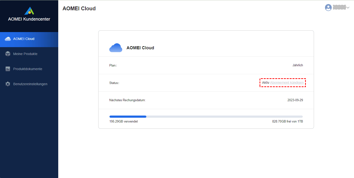 - AOMEI wird die in AOMEI Cloud gespeicherten Benutzerdaten und die mit den Backup-Aufgaben verbundenen Daten beibehalten. Es wird die in der AOMEI Cloud gespeicherten Benutzerdaten und die damit verbundenen Aufgaben nur löschen, wenn der Testzeitraum oder ein Abonnement abgelaufen ist. Bitte informieren Sie sich über weitere Details zur Datenaufbewahrungsrichtlinie.