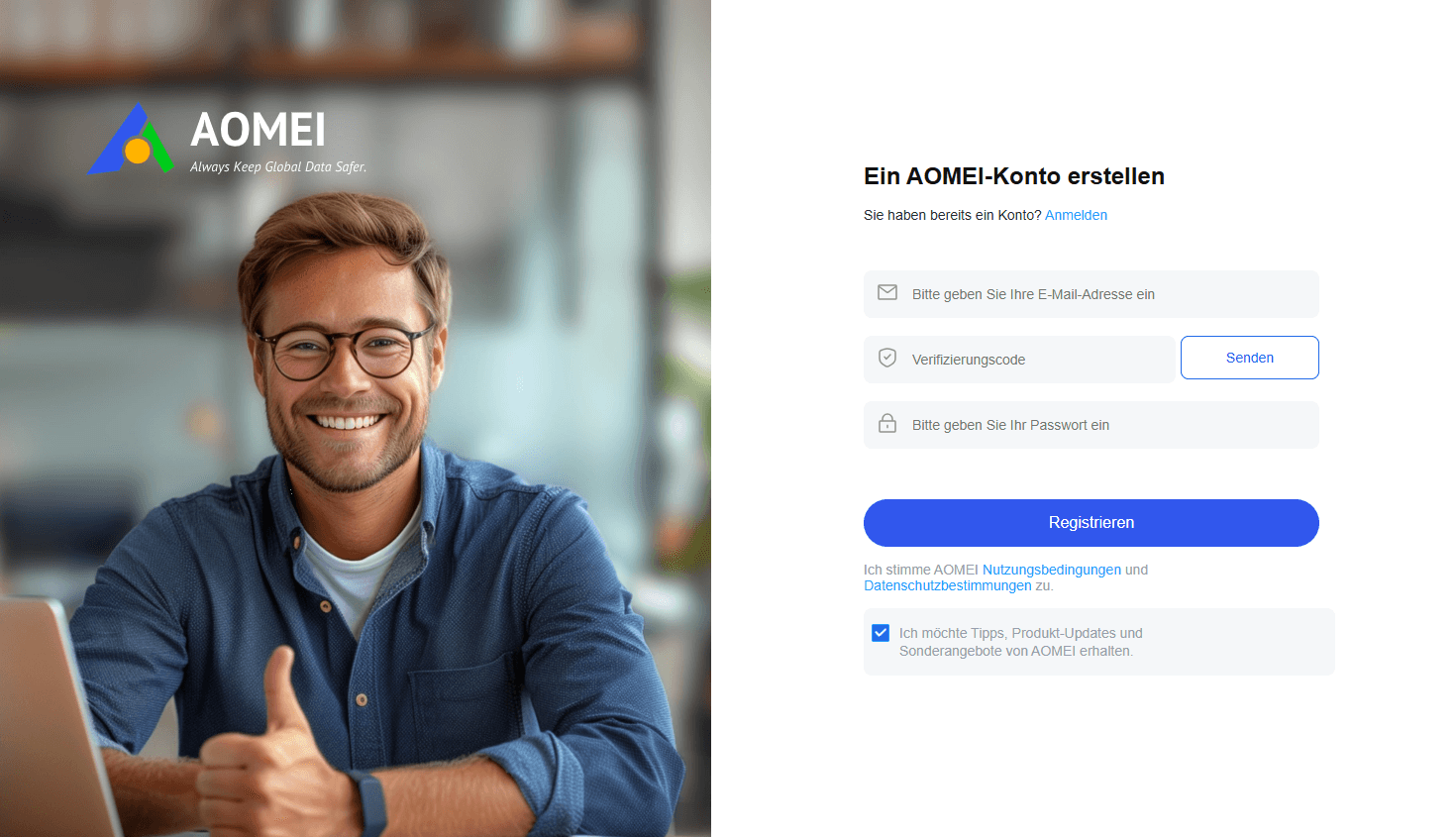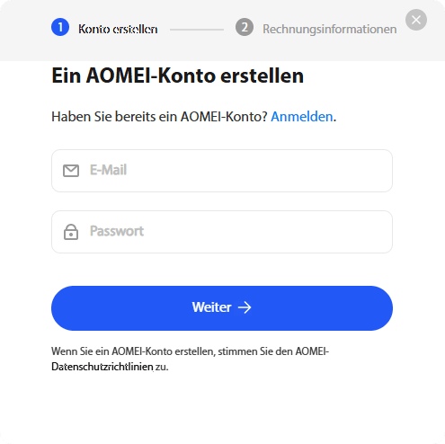 Wenn Sie die Kombination aus AOMEI Backupper+AOMEI Cloud von den offiziellen Seiten von AOMEI bestellen, müssen Sie in der Regel zunächst ein AOMEI-Konto erstellen. Wenn Sie bereits ein AOMEI-Konto haben, können Sie sich direkt anmelden.
