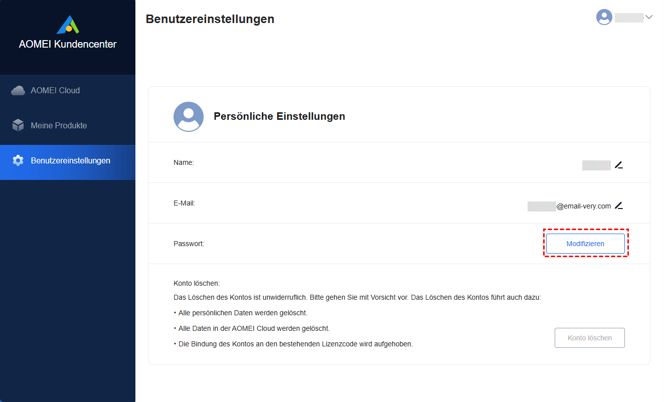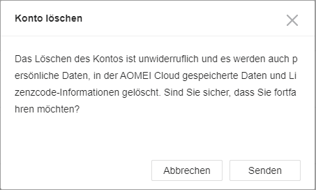 Achtung! Das Löschen eines Kontos ist unwiderruflich. Bitte gehen Sie mit Bedacht vor. Das Löschen eines Kontos wird alle persönlichen Daten, alle Daten in AOMEI Cloud löschen und die Bindung des Kontos an den bestehenden Lizenzcode aufheben.