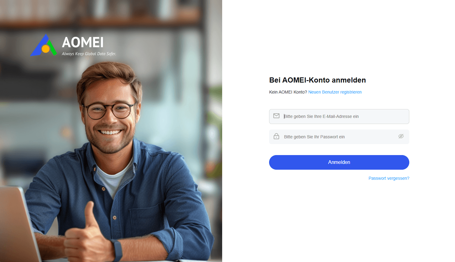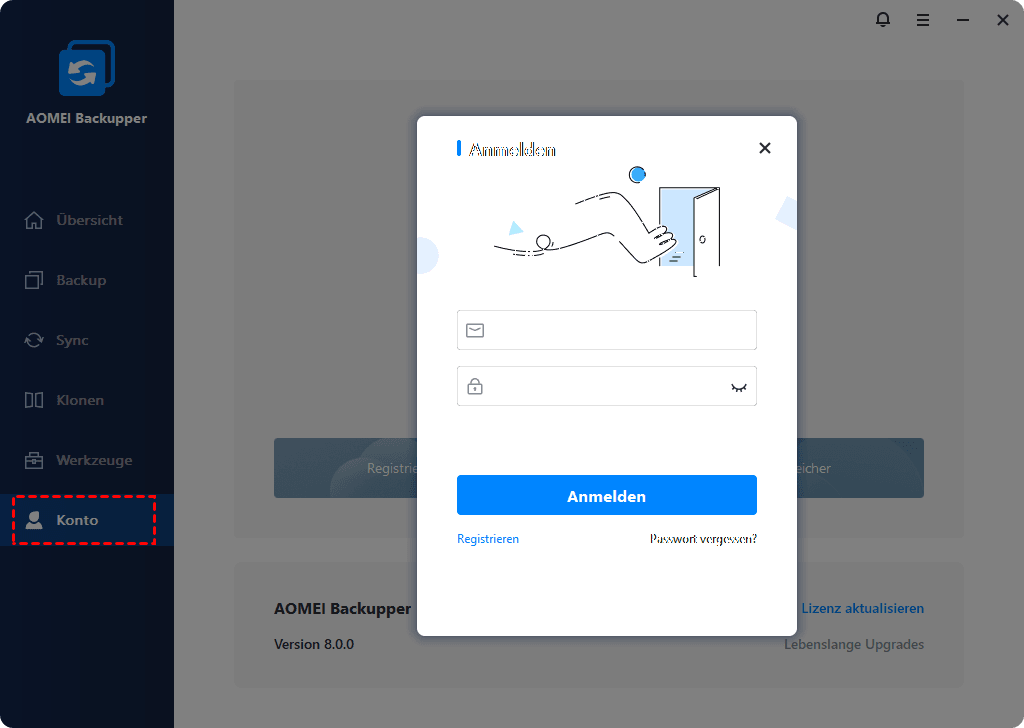 Tipps: Für die Anmeldung bei AOMEI Cloud in AOMEI Backupper müssen Sie die E-Mail-Adresse und das Passwort des Kontos verwenden. Die Kombination aus Bestell-E-Mail und Bestellnummer kann nicht verwendet werden, um sich bei AOMEI Cloud in AOMEI Backupper anzumelden.