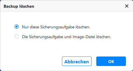 7. Backup löschen: Sie können diese Sicherungsaufgabe auf der Registerkarte „Übersicht“ löschen, oder Sie können sowohl die Sicherungsaufgabe auf der Registerkarte „Übersicht“ als auch die zugehörigen Image-Dateien am Zielort löschen.