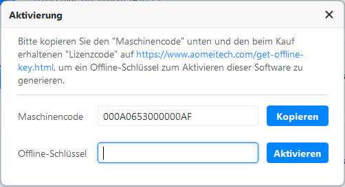 Wenn Ihr Computer keine Internetverbindung hat, können Sie die Software offline registrieren. Bitte beachten Sie, dass der Offline-Schlüssel individuell generiert werden muss.
