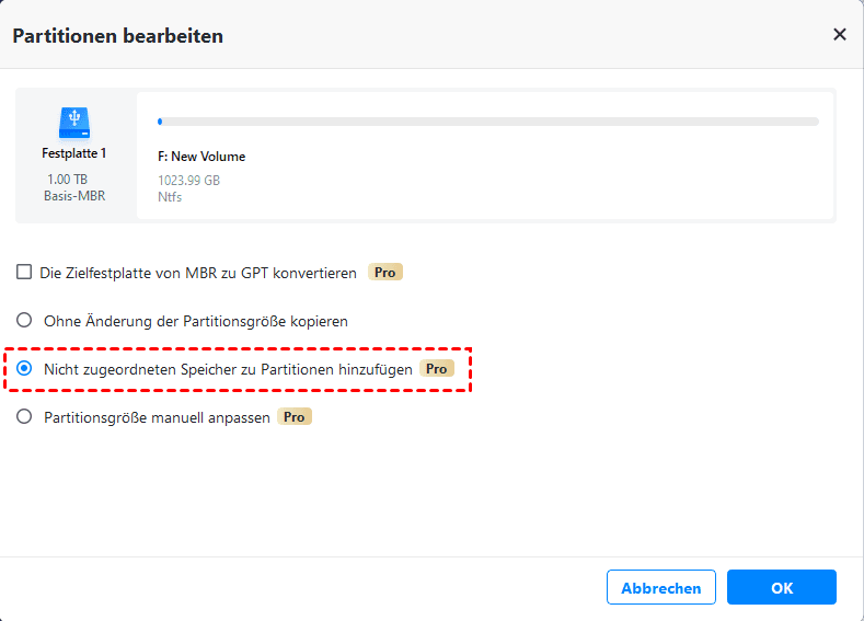 - Partition bearbeiten: Wenn die Kapazität Ihrer Zielfestplatte größer als die ursprüngliche SSD ist, kann Ihnen diese Option dabei helfen, die Partitionsgröße auf der Zielfestplatte anzupassen, um nicht zugeordneten Speicherplatz nach dem Klonen zu vermeiden.