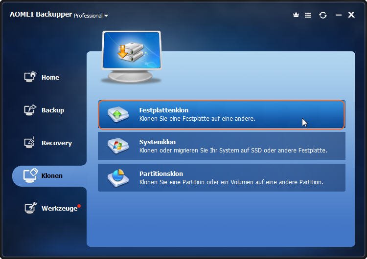 Es ist enttäuschend, dass alle Windows-Versionen keine Klon-Software haben. Daher können Sie sich für eine Drittanbieter-Software zum Klonen von Festplatten entscheiden. Hier empfehle ich Ihnen AOMEI Backupper Professional, um in Windows 10 die Festplatte bootfähig zu klonen. Sie können auch Windows 10 mit einem bootfähigen USB-Stick klonen.