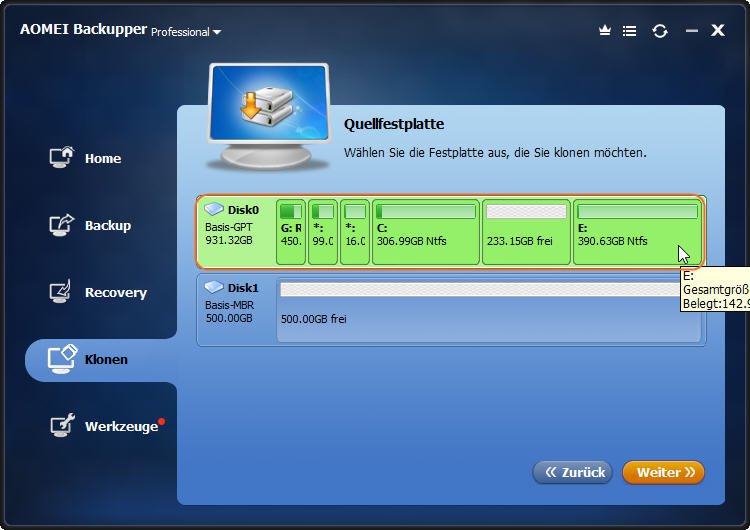 Wenn Ihre neue Festplatte nicht ausreicht, um das Startlaufwerk und alle installierten Programme, Dateien und Ordner zu speichern, können Sie Windows 10 mit der „Systemklon“-Funktion auf neue Festplatte übertragen. Beachten Sie, dass dabei nur die Systempartition auf diesem Startlaufwerk geklont wird.