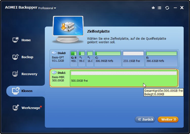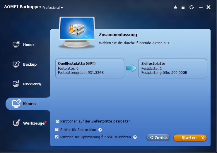 🌟Bitte beachten Sie, dass alle Daten auf der Zielfestplatte oder SSD überschrieben werden. Wenn es kritische Dateien gibt, sichern Sie diese Dateien bitte im Voraus.