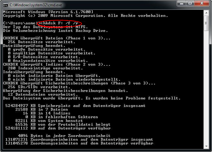 chkdsk F: /f /r (er findet und repariert die logischen und physischen Probleme Ihrer Festplatte, ersetzt F: durch den entsprechenden Laufwerksbuchstaben)