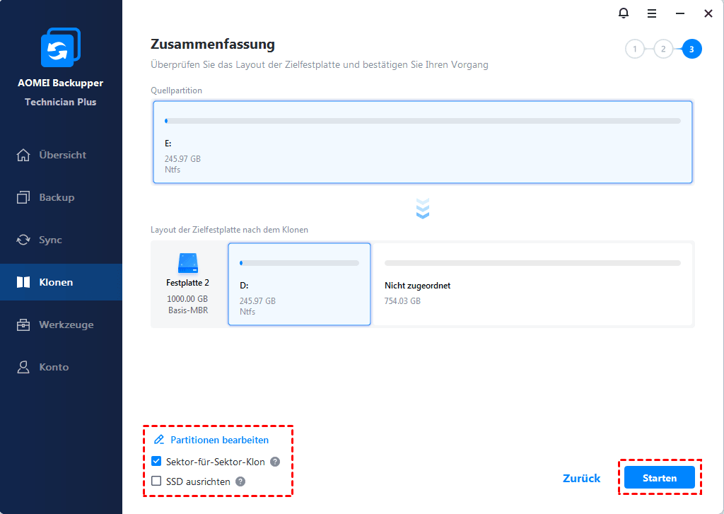 Bitte beachten Sie, dass die Zielpartition während des Klonvorgangs überschrieben wird. Bitte sichern Sie wichtige Dateien im Voraus. Lesen Sie dann weiter unten, um detaillierte Schritte zu erfahren.