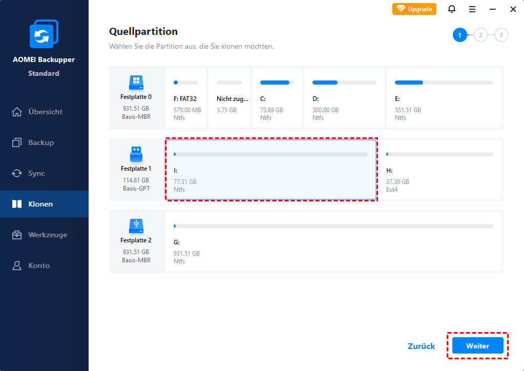 2. Klicken Sie auf dem Startbildschirm auf Klonen und wählen Sie Partitionsklon. Wenn Sie die gesamte Festplatte einschließlich der EFI-Partition klonen möchten, können Sie Festplattenklon verwenden.