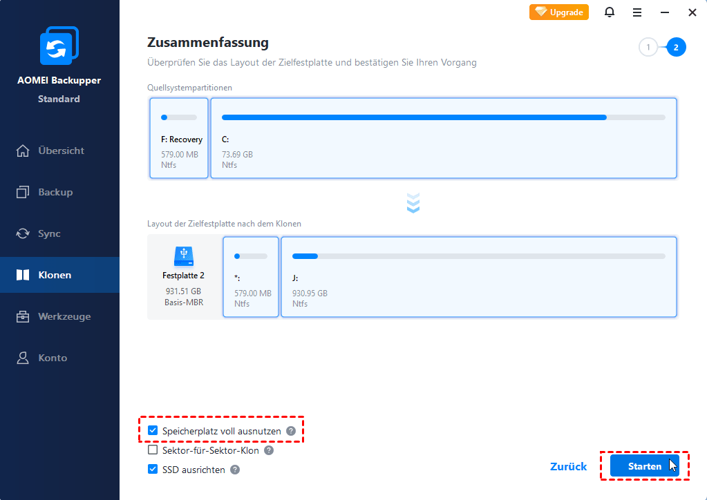 - Speicherplatz voll ausnutzen: Wenn die Zielpartition größer ist als die ursprüngliche Systempartition, wird mit dieser Option der nicht zugewiesene Speicherplatz auf der Zielpartition der Systempartition zugewiesen, um den Speicherplatz vollständig zu nutzen.