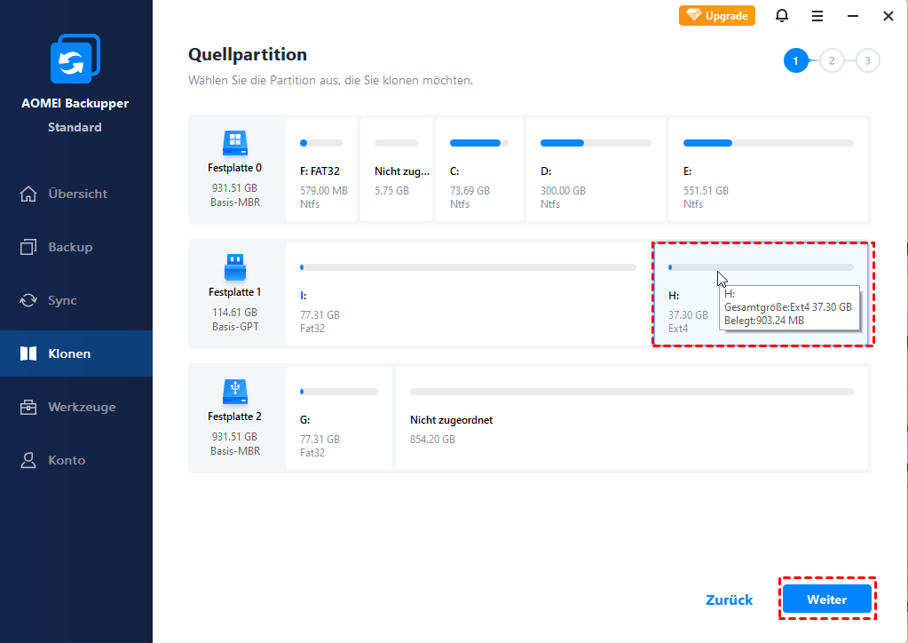 Schritt 2. Im nächsten Fenster wählen Sie die Ext4-Partition als die Quellpartition und klicken Sie auf „Weiter“.