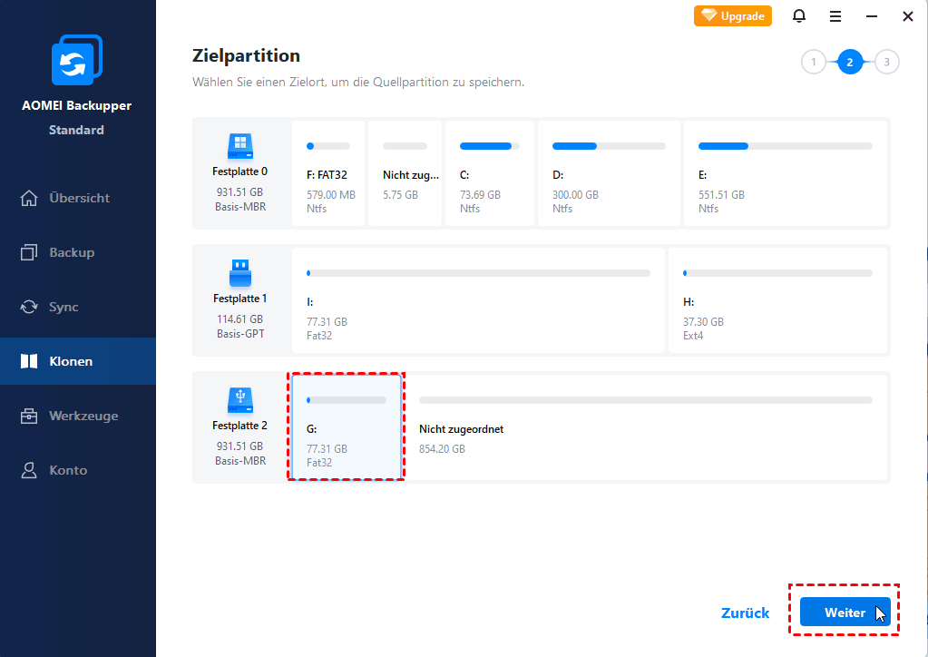 Schritt 3. Wählen Sie die andere Festplatte als die Zielpartition und klicken Sie auf „Weiter“. Eine lokale Festplatte oder eine externe Festplatte kann als die Zielpartition ausgewählt werden.