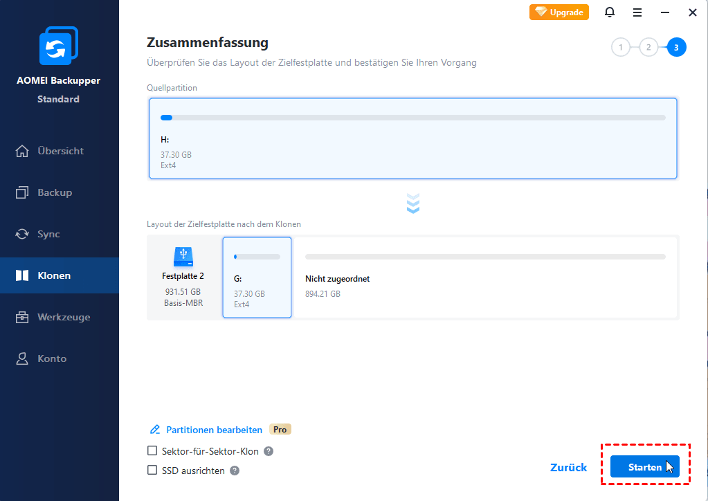 Jetzt kommt die Frage, wie man die Ext4-Partition auf andere Festplatte einfach und sicher klonen kann? Ich glaube, dass Sie eine zuverlässige Partition Klonen Software brauchen.
