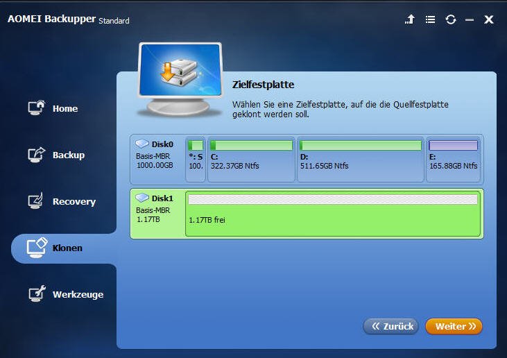 - Sie können nur ein Laufwerk vorbereiten, die auf der Festplatte mit gleicher Datengröße entspricht. So können Sie auch eine große Festplatte auf eine kleinere Festplatte oder SSD klonen.