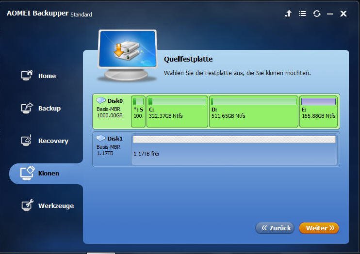 Es ist hilfreich für eine große Festplatte auf kleinere SSD zu klonen. Somit können Sie Ihr Betriebssystem und Anwendungen von der kleineren SSD ausführen und die große Datei auf der Festplatte halten.