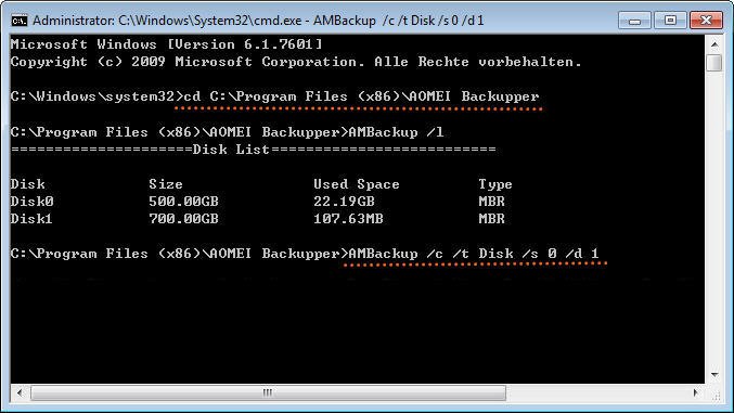 Schritt 3. Geben Sie AMBackup /c /t Disk /s 1 /d 2 ein und drücken Sie die Eingabetaste, um alle Inhalte von Festplatte 1 auf Festplatte 2 zu kopieren. Sie sollten die Quell- und Zielfestplatten zu Ihrer eigenen wechseln.