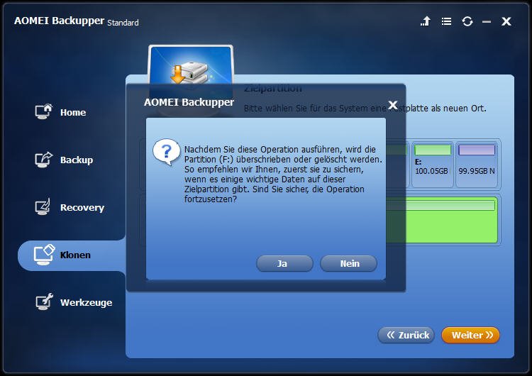 Hinweis: Wenn der neue gewählte Zielort eine Partition ist, wird AOMEI Backupper ein Fenster automatisch geöffnet, in dem Sie gefragt werden, welche Partition (en) gelöscht oder überschrieben werden sollen, und ob Sie den Vorgang wirklich fortsetzen möchten. Klicken Sie auf „OK", um fortzufahren. Wenn sich wichtige Daten auf dieser Partition befinden, empfehlen wir Ihnen, auf „Abbrechen" zu klicken, um den aktuellen Vorgang zu beenden und zunächst eine Dateisicherung durchzuführen.