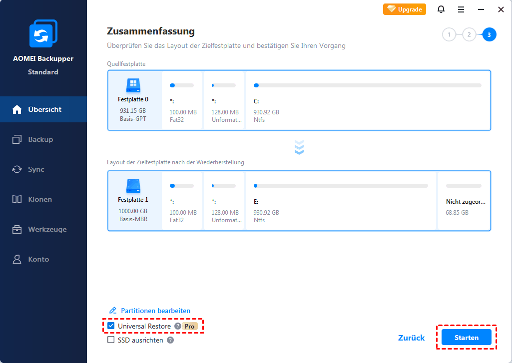 Standardmäßig klont diese Software nur die gebrauchten Sektoren des Systems, sodass Sie ohne Startprobleme das Betriebssystem auf kleinere SSD migrieren können.