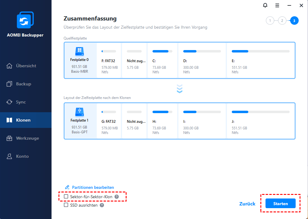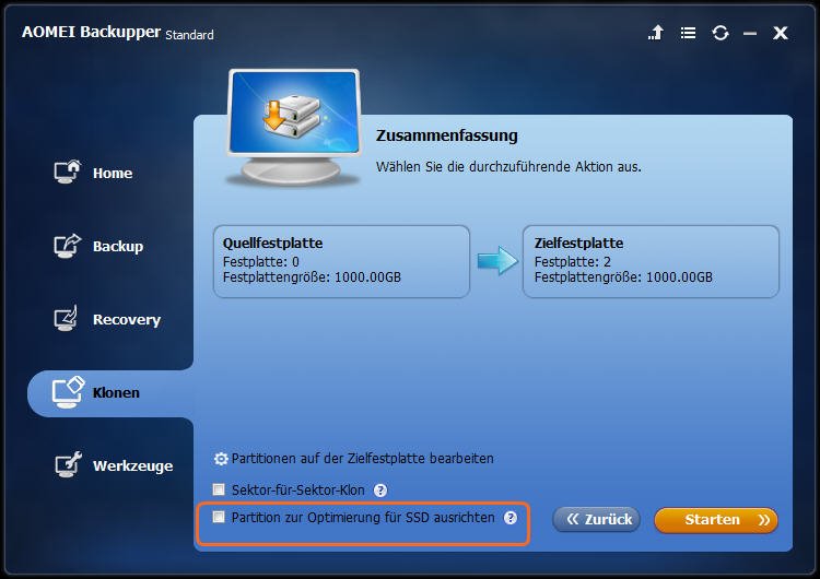 4. Markieren Sie die Option „SSD ausrichten“, um die SSD-Leistung zu verbessern. Klicken Sie auf „Starten“, um den Klon auszuführen.