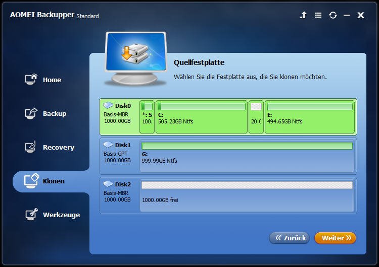 Mit AOMEI Backupper können Sie die gesamte Festplatte klonen und die geklonte SSD kann gestartet werden. Wenn Ihre SSD kleiner als die ursprüngliche Festplatte ist, passt das Programm die Partitionsgröße auf der SSD automatisch an die gesamte Festplatte an. Befolgen Sie nun die folgenden Schritte: