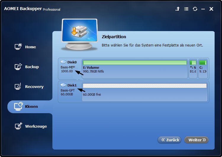 AOMEI Backupper Professional ist eine leistungsstarke Festplatte Klonen Software, mit der Sie MBR-Datenträger mit minimalem Aufwand auf GPT-Datenträger klonen können.