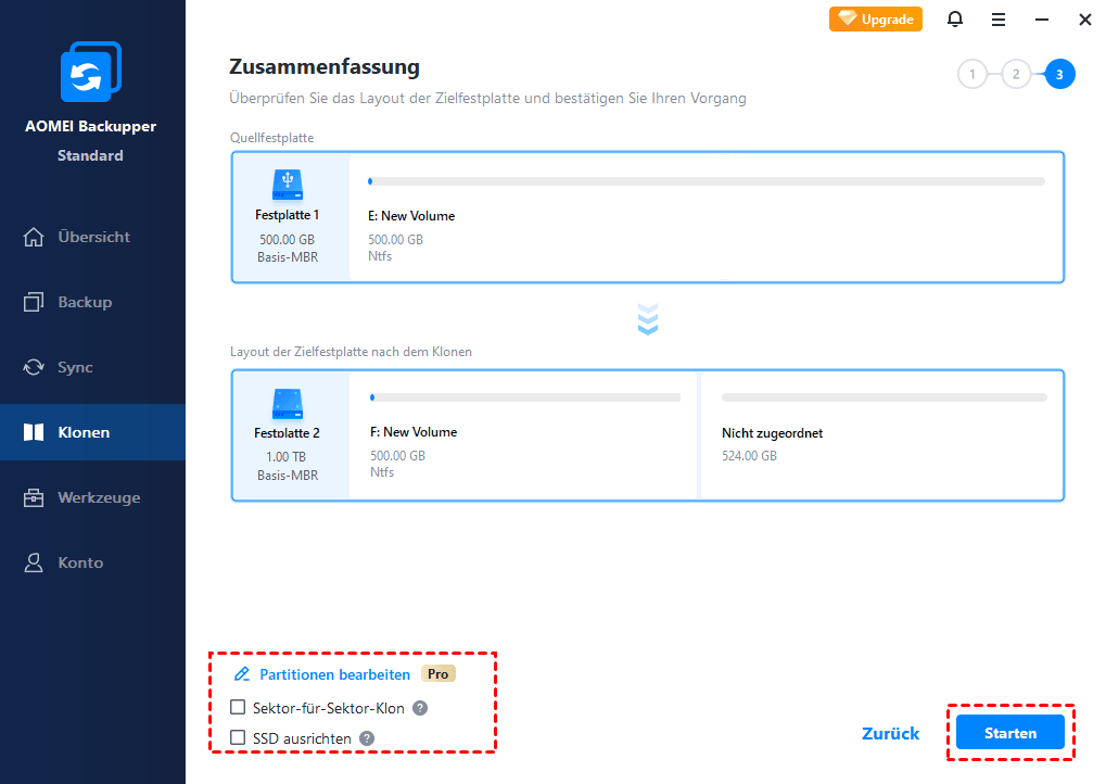 * Die Standard-Edition unterstützt nur das Klonen von Nicht-Systemfestplatten. Wenn Sie eine Festplatte mit dem Betriebssystem klonen möchten, aktualisieren Sie bitte auf höhere Editionen wie AOMEI Backupper Professional.