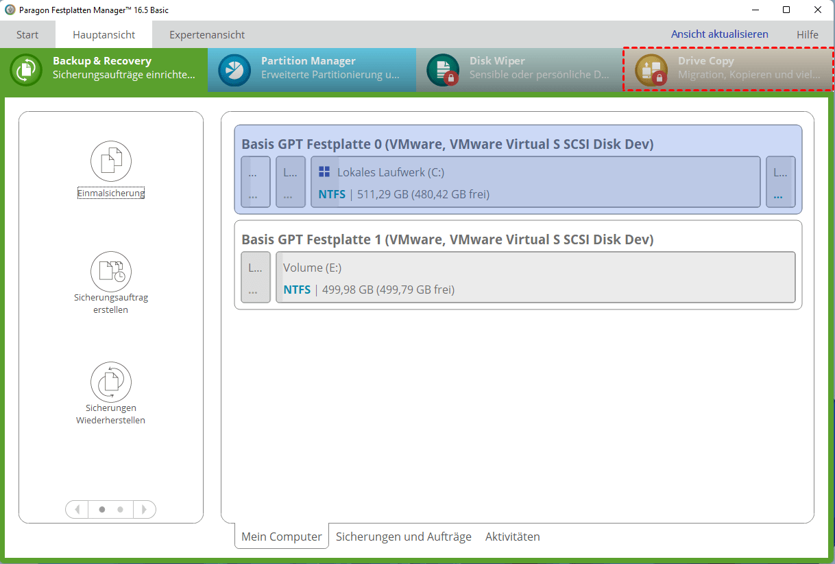 Wie Sie oben auf dem Bild sehen können, ist die Drive Copy-Funktionalität in der Basic-Version des Festplatten Managers gesperrt. Sie müssen also auf die erweiterte Version upgraden, um Drive Copy freizuschalten. Erfahren Sie unten, wie Sie Paragon Drive Copy detailliert verwenden: