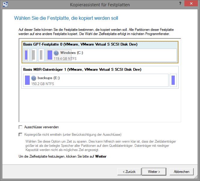 4. Wählen Sie eine Festplatte (falls mehrere), auf die alle Daten der Quellplatte kopiert werden sollen.