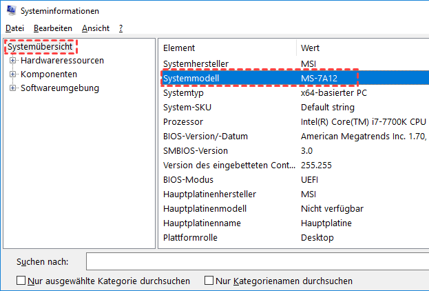 - Der Wert für Systemmodell ist das Motherboard-Modell.