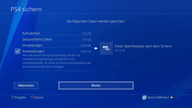 2. Bestätigen Sie, welche Daten Sie sichern wollen. Wenn Sie dieses Element „Anwendungen“ deaktivieren, müssen Sie sie herunterladen und neu installieren, nachdem Sie Ihre PS4 mit dem von Ihnen erstellten Backup wiederhergestellt haben.