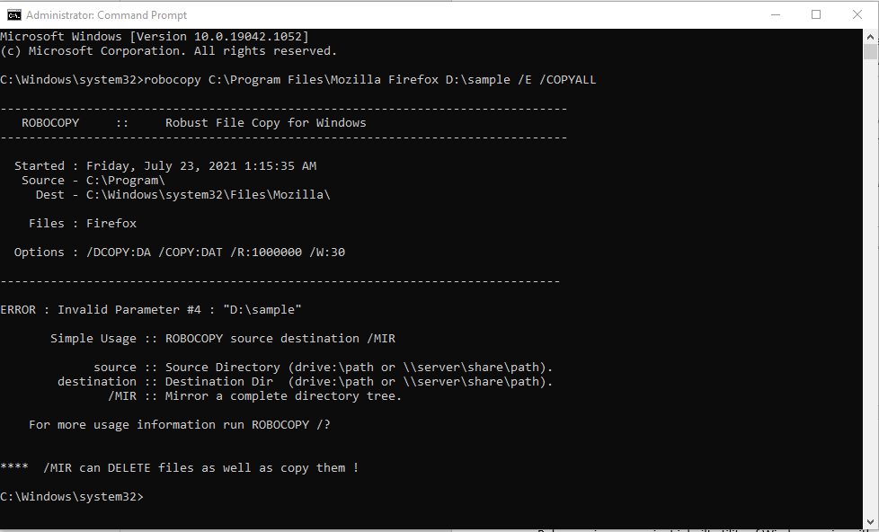 Hinweis: Bitte beachten Sie, dass beim Versuch, die „Robocopy copyall“-Syntax zum Kopieren einer Datei vom C-Laufwerk auf das D-Laufwerk zu verwenden, möglicherweise eine Fehlermeldung mit ungültigen Parametern angezeigt wird, wie im begleitenden Bild gezeigt.