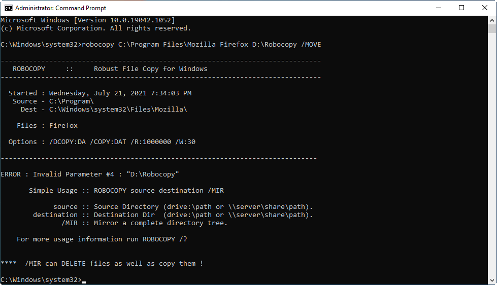 Hinweis: Bitte beachten Sie, dass bei Verwendung der Robocopy-Verschiebungssyntax möglicherweise eine Fehlermeldung mit ungültigen Parametern angezeigt wird, ähnlich wie im zuvor beschriebenen Szenario.