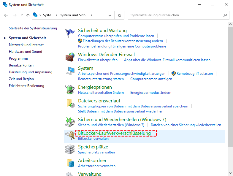1. Gehen Sie zu Systemsteuerung > System und Sicherheit > BitLocker-Laufwerkverschlüsselung.