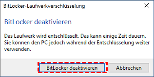 3. Es wird eine Meldung angezeigt, die Sie darüber informiert, dass das Laufwerk entschlüsselt wird und dass die Entschlüsselung einige Zeit dauern kann. Klicken Sie auf BitLocker deaktivieren, um den Entschlüsselungsprozess zu starten.