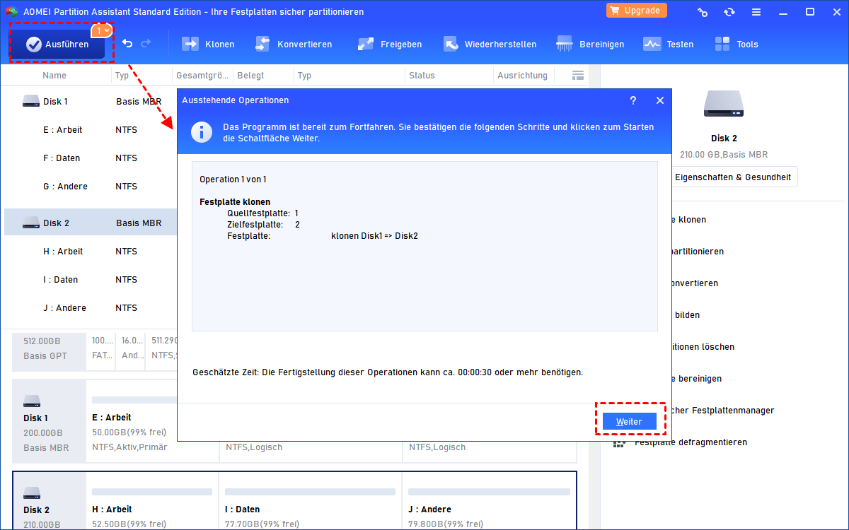 Schritt 5. Klicken Sie auf „Ausführen“ > „Fortfahren“, um die anstehenden Operationen auszuführen.