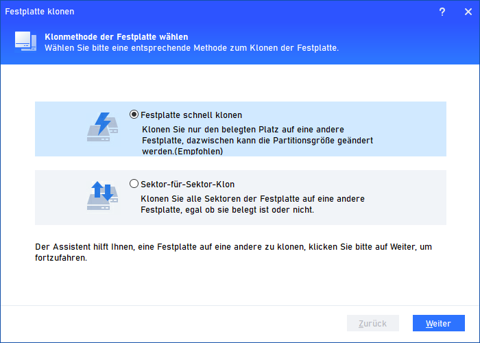Schritt 2. Wählen Sie im Popup-Fenster die SSD-Klonmethode, „Festplatte schnell klonen“ oder „Sektor-für-Sektor-Klon“.