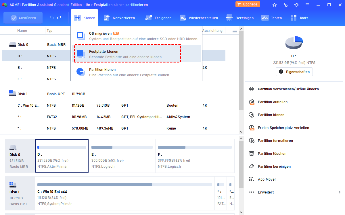 Es kann Ihnen dabei helfen, eine kleinere SanDisk SSD auf eine größere zu klonen oder eine HDD auf SanDisk SSD zu klonen. Mit der Funktion „Intelligentes Klonen“ können Sie nur den verwendeten Teil kopieren, was es möglich macht, ein größeres Laufwerk auf kleinere SSD zu klonen.