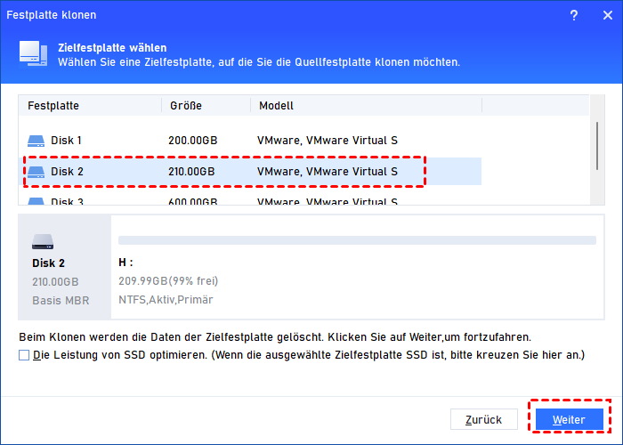 Schritt 3. Wählen Sie die kleinere SSD als Quellfestplatte und die größere SSD als Zielfestplatte. Denken Sie daran, die Option „Die Leistung von SSD optimieren“ zu aktivieren, um die SSD-Partition automatisch auszurichten.