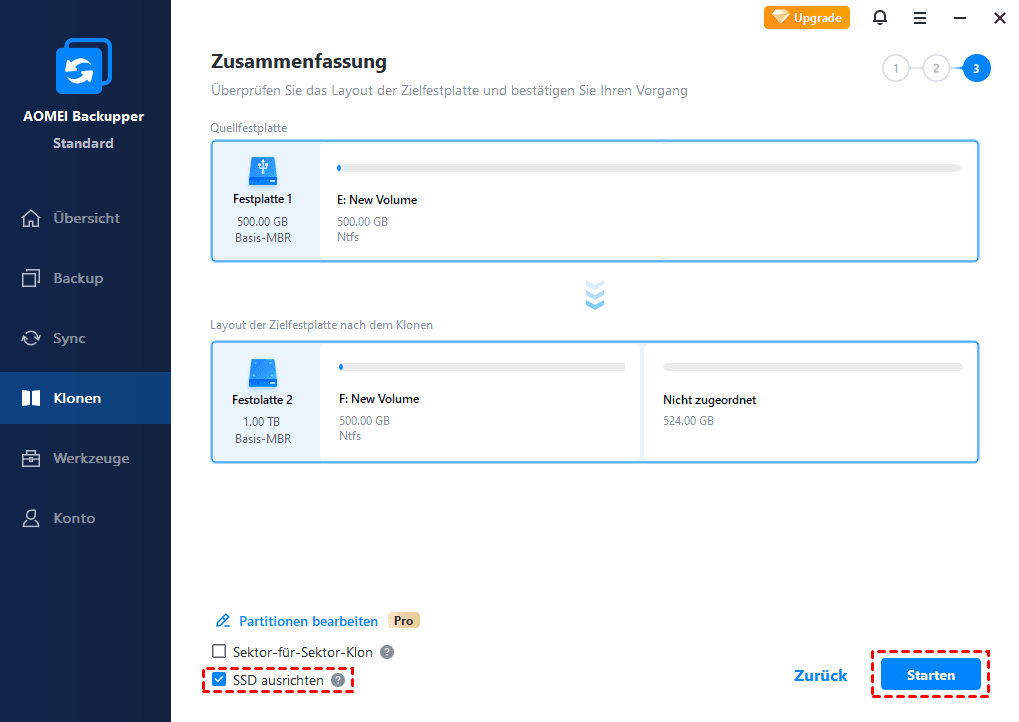 Schritt 3. Kreuzen Sie die Option „SSD ausrichten“ an, um die Leistung der Ziel-SSD zu optimieren, und klicken Sie dann auf „Starten“, um den Klonvorgang auszuführen.