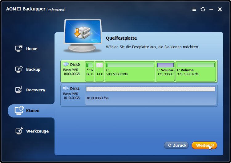 Um die Festplatte auf das Toshiba SSD-Laufwerk zu klonen, müssen Sie AOMEI Backupper Professional herunterladen, um es zu verwenden. Es ist klein und einfach zu bedienen. Als Nächstes werden wir die detaillierten Schritte zu diesem Klonen vorstellen: