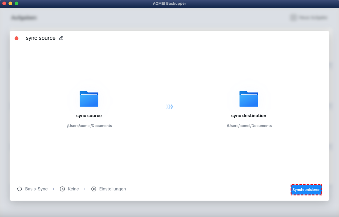 Die beste Dateikopiersoftware für Mac – AOMEI Backupper Mac kann Ihnen auch beim Fototransfer helfen. Es bietet umfassende Synchronisierungsfunktionen, um Ihren unterschiedlichen Bedürfnissen gerecht zu werden.