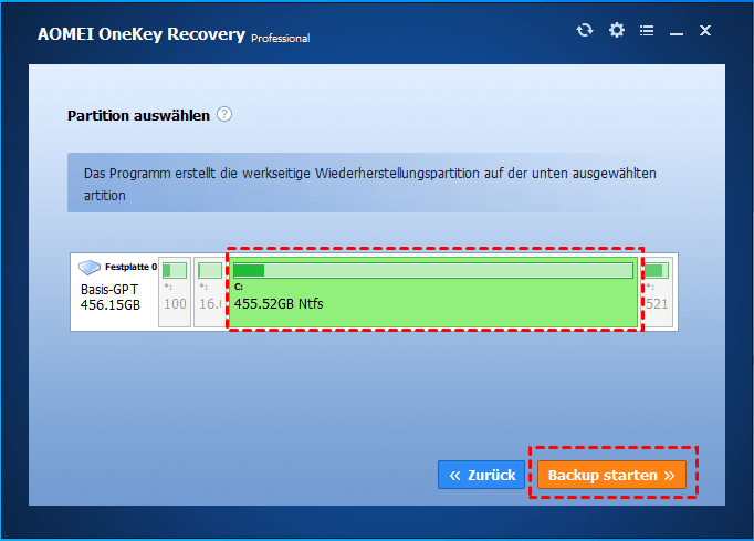 Schritt 3. Wählen Sie eine Partition als Ihre Werkswiederherstellungspartition aus. Sie sollte genügend Platz für Ihr Systemabbild haben. Klicken Sie anschließend auf Backup starten.