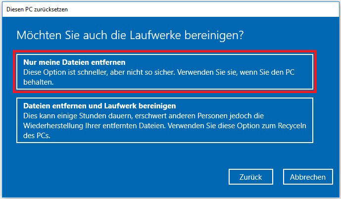 1. Klicken Sie auf Start > Einstellungen > Update und Sicherheit > Wiederherstellung > Los geht’s und wählen Sie dann im Fenster Option auswählen die Option Werkseinstellungen wiederherstellen.
