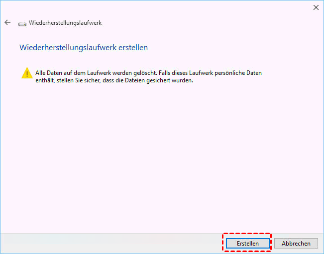 4. In diesem Fenster klicken Sie auf „Erstellen“, um das Wiederherstellungslaufwerk erstellen zu beginnen.